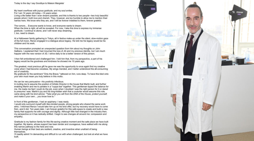 U jedinstvenoj izjavi kakvu samo neprikosnoveni simbol visoke mode dvehiljadih može da napiše, Galliano je naveo sledeće. Moje srce preplavljeno je radosnom zahvalnošću, a moja duša se smeši. Planovi o njegovom povlačenju već su neko vreme kružili kao glasine, ali vest je ipak odjeknula kao da svi prvi put čujemo za to. Na Instagram objavi, gde je Galliano podelio svoju izjavu (zajedno s fotografijom na kojoj puši cigaretu na prozoru Margiela studija), kolege kreativni direktori, modni velikani, veterani kritike i brojni fanovi ostavili su duboki naklon.