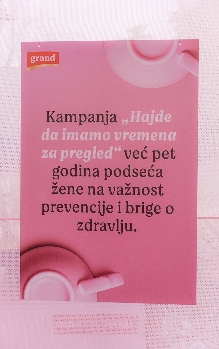 Oktobar mesec posvećen je borbi protiv raka dojke, a ovog puta obeležava se i poseban jubilej – pet godina kampanje Grand kafe Hajde da imamo vremena za pregled. Pod prepoznatljivim sloganom Ne gledaj u šolju, pregledaj se! kroz akciju besplatne mamografije, koju u okviru projekta sprovodi Institut za javno zdravlje Srbije Dr Milan Jovanović Batut, pod pokroviteljstvom Ministarstva zdravlja, do sada je pregledano više od 45.000 žena.