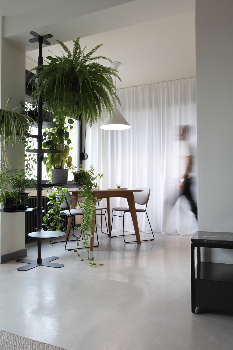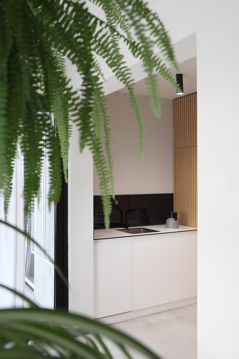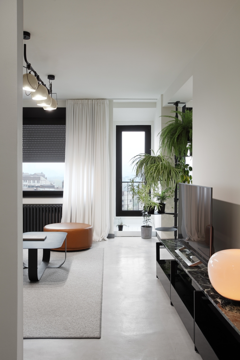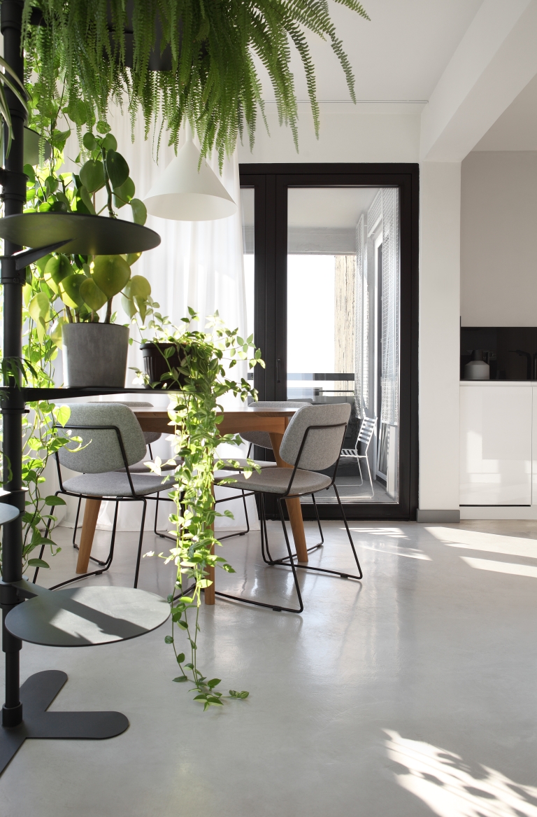 Veoma svetla dnevna zona obuhvata dnevnu sobu, na koju se nadovezuje trpezarijski deo i blago uvučena kuhinjska niša. Jedan od ciljeva bio je postići rasterećenost i fluidnost ambijenta, pa je u tu svrhu korišćen nameštaj finih, tankih silueta i neutralnih boja. Pored toga, komadi zemljanih tonova i bogato prirodno zelenilo unose puls i toplinu u prostor.