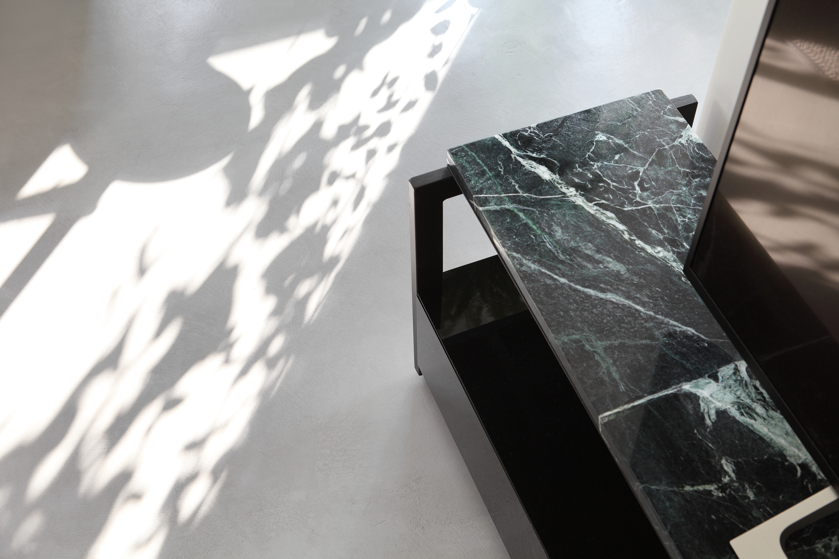 Kada je u pitanju ovaj stan na Novom Beogradu, jasno je da su u dizajnu korišćeni materijali raznovrsnih tekstura i boja. To su, između ostalog, beton, svetli furniri hrasta, orahovo drvo, tamnozeleni mermer, različite tkanine, dekorativne lajsne i ogledalo.