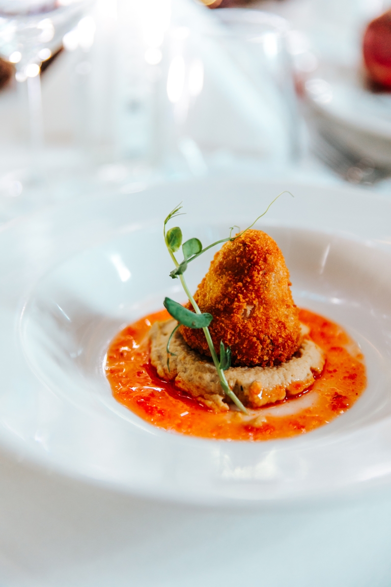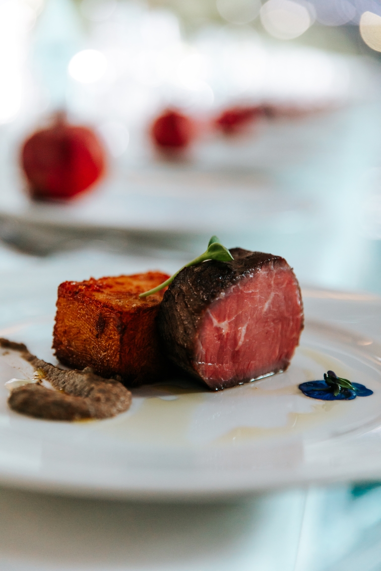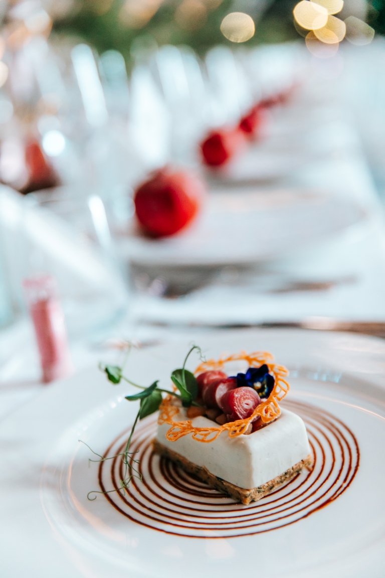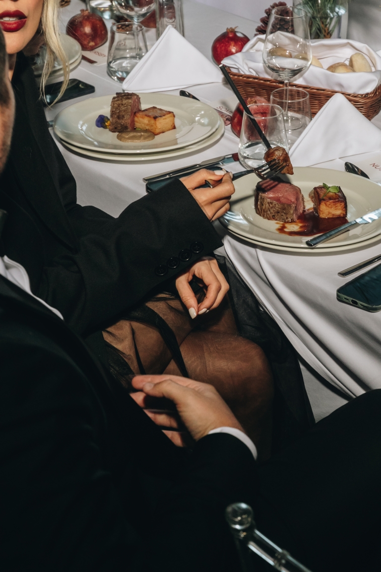Za specijalni praznični meni bio je zadužen Sava Centar. Zvanice su uživale u hladnom predjelu (Panacota od plavog sira sa Iberico pršutom i kompotom od viljamovke), toplom predjelu (Rizzoto arancini sa shitake humusom), glavnom jelu (Suvidirani Angus biftek sa pireom od divljih pečuraka) i desertu (Black Forest Meets KitKat). Jasno je da su zvanice tokom večeri uživale u fuziji ukusa, a posebna pažnja usmerena je i na selekciju peciva.