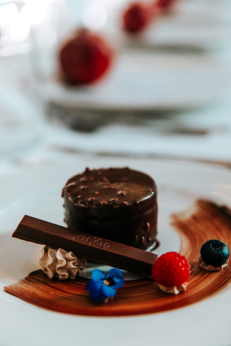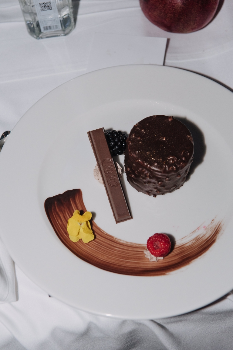 Limitirana KitKat Chunky – Crunchy Double Choc čokolada, koja se našla u sklopu deserta, sastavljena je od hrskavog kakao vafla, punjenja od kakao krema i hrskavih komadića kakaovih zrna koji su preliveni mlečnom čokoladom. Ovaj desert je moderni prikaz klasike sa dodatnim prefinjenim slojevima ukusa, a KitKat čokolada simbolično poziva prisutne na trenutak uživanja u sezonskom duhu.