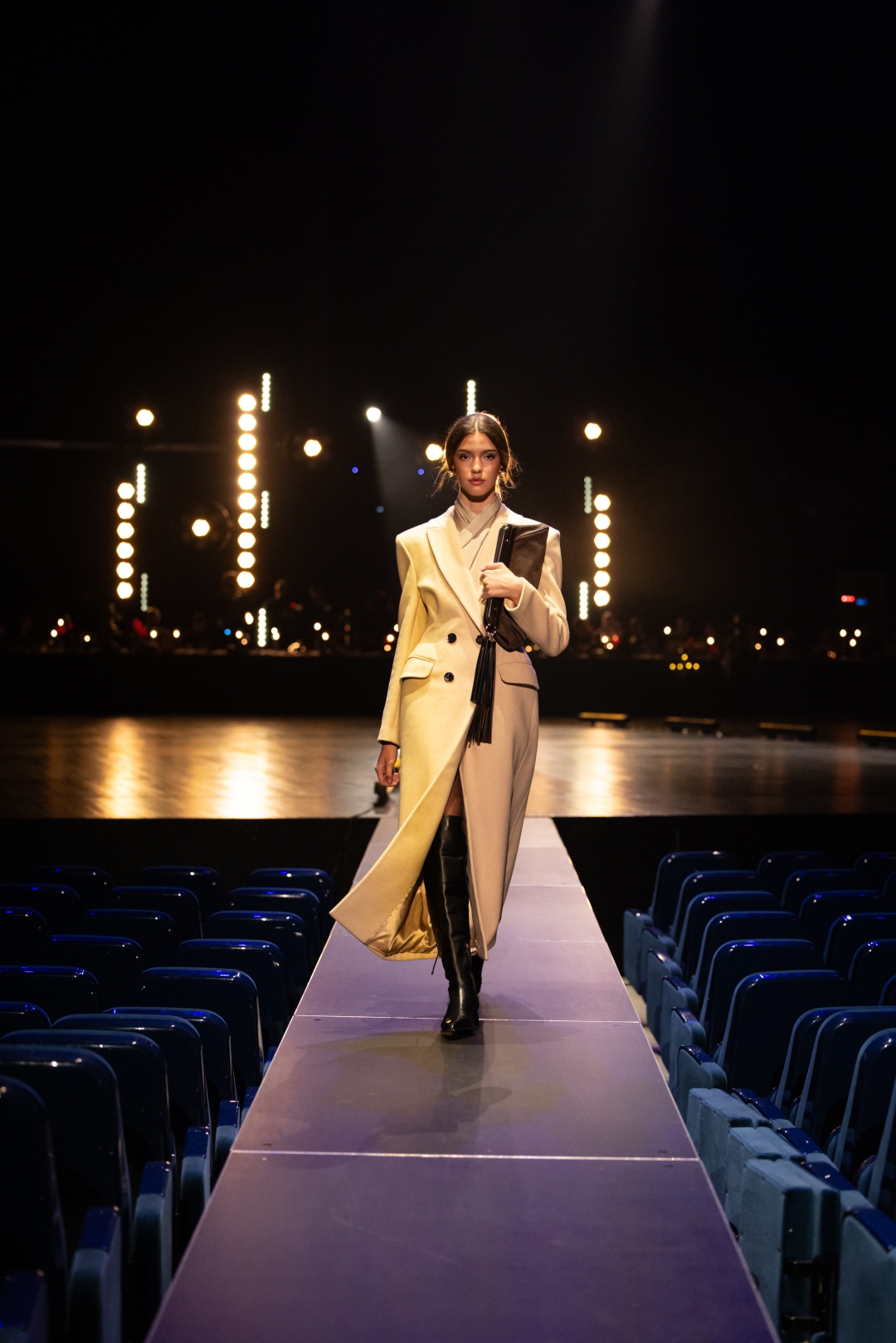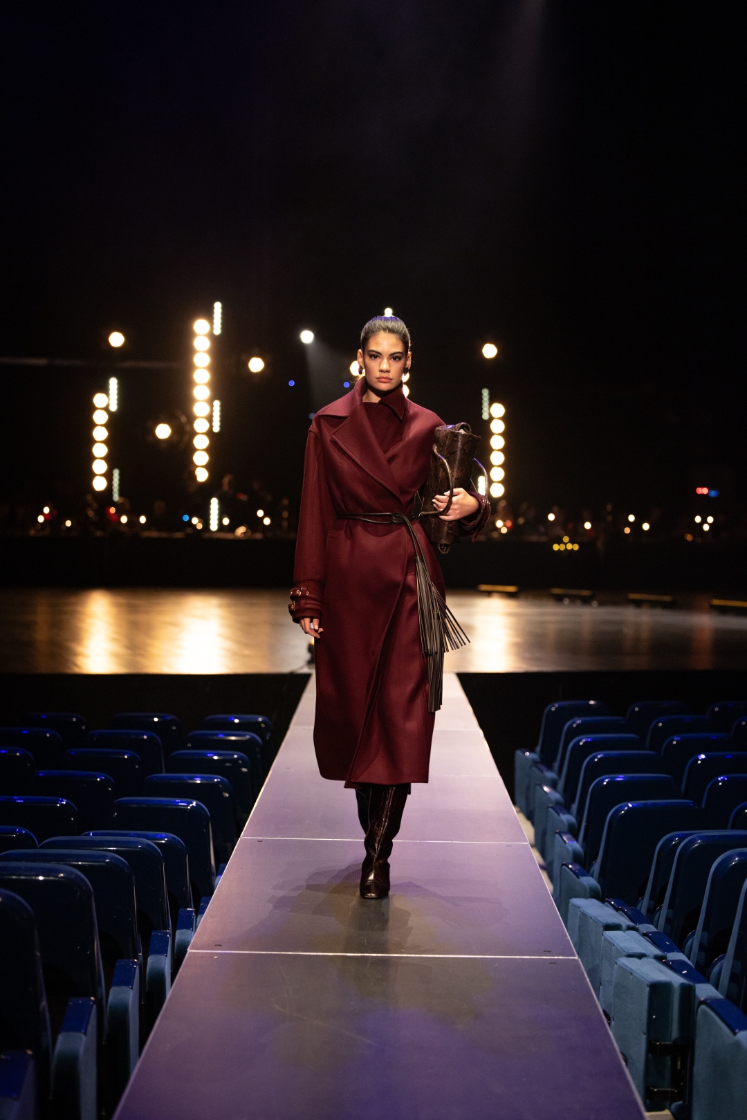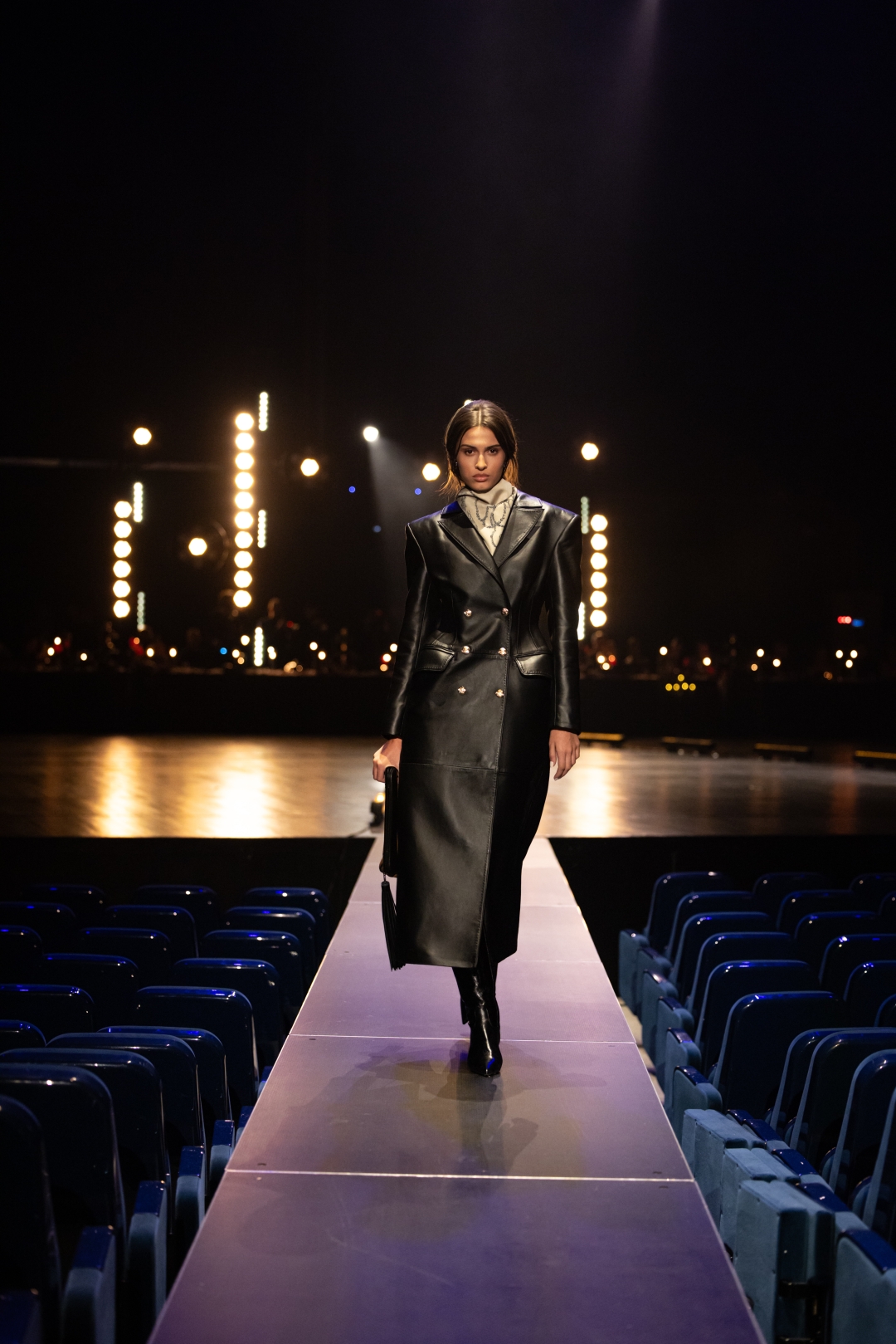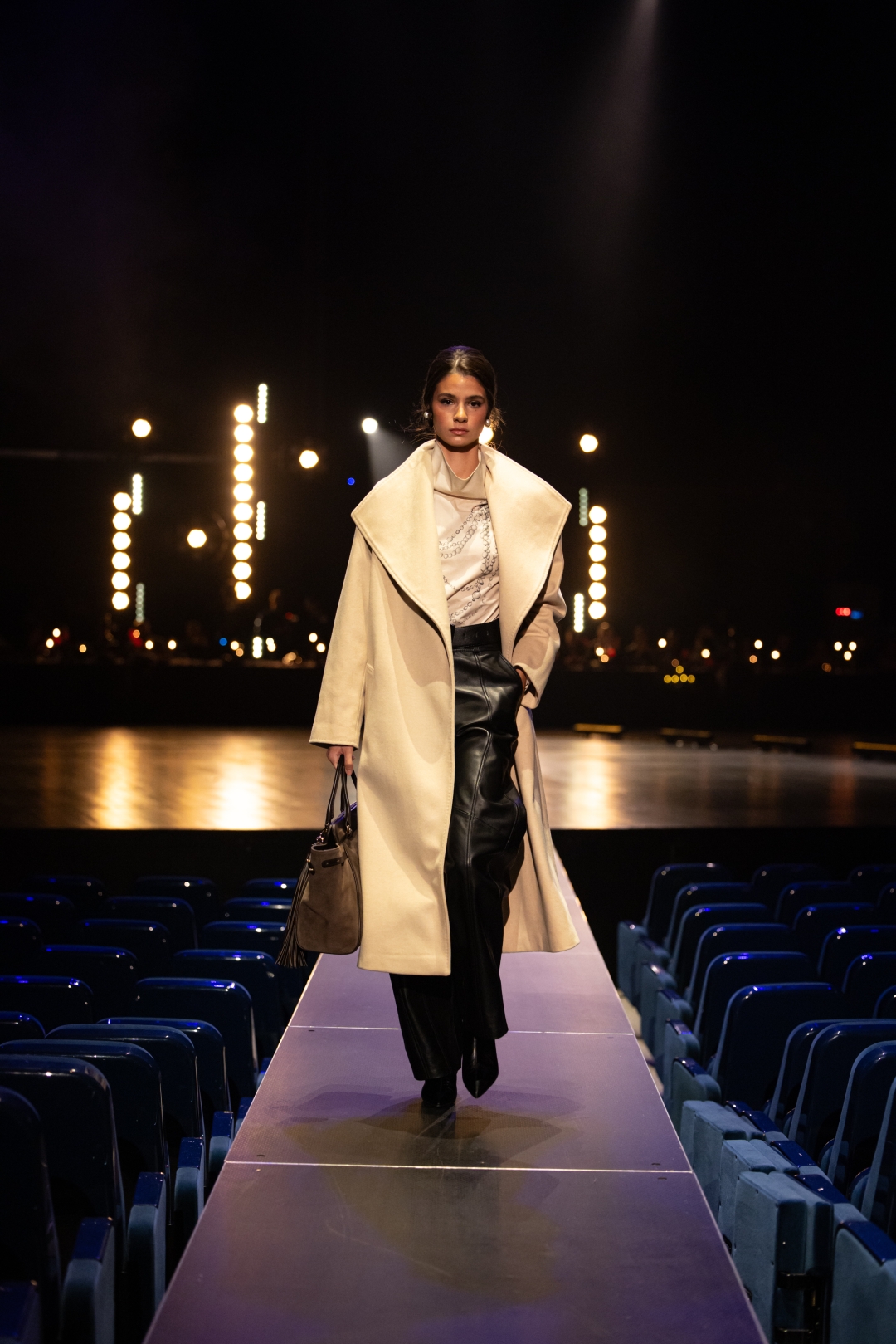 Na pisti dominiraju dugi kaputi koji prate liniju tela, naglašeni struk i oštri reveri, stvarajući utisak samouverenosti i luksuza. Paleta boja je sofisticirana: Karamela, konjak, maslinasto zelena, tamna čokolada i klasična crna. Ženski komadi balansiraju između strogoće i senzualnosti – oversized kaputi se kombinuju s visokim čizmama, kožom i providnim topovima. Muška kolekcija donosi klasične kapute, puffer jakne i shearling modele, sve stilizovano s dolčevitama, elegantnim pantalonama i torbama koje daju poslovni, ali izrazito moderan izgled.