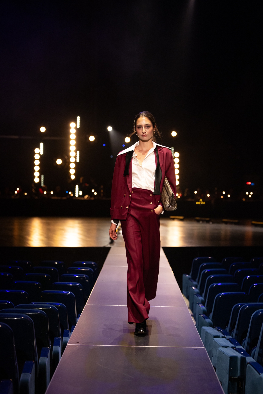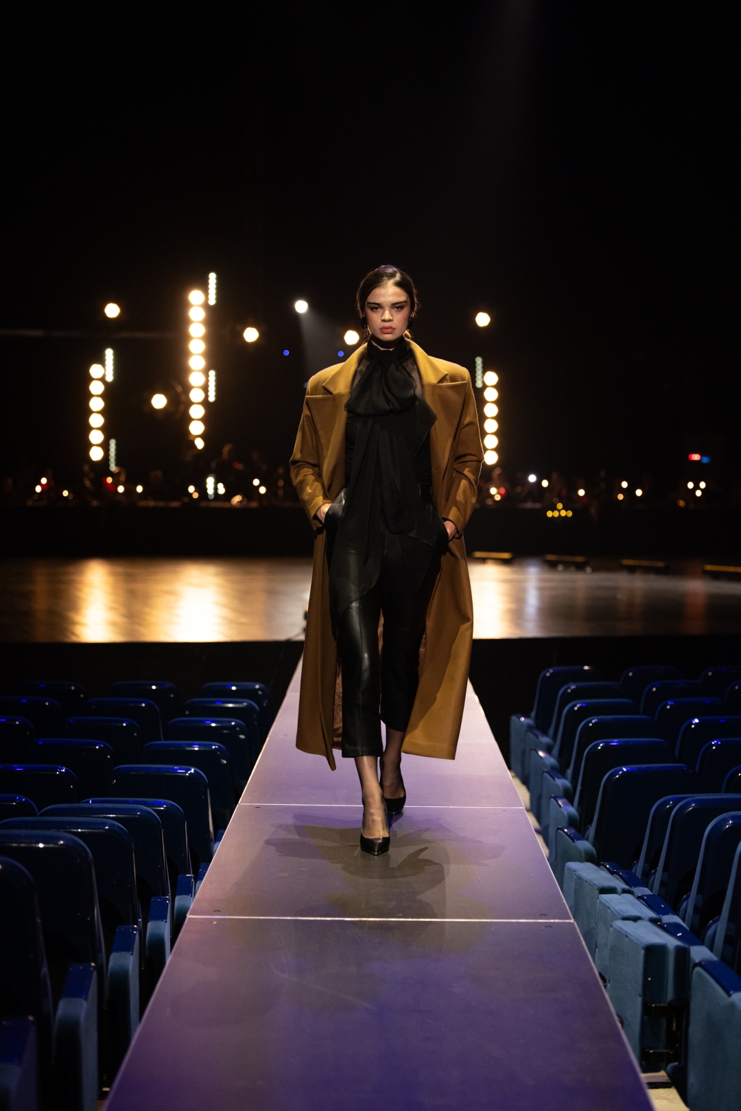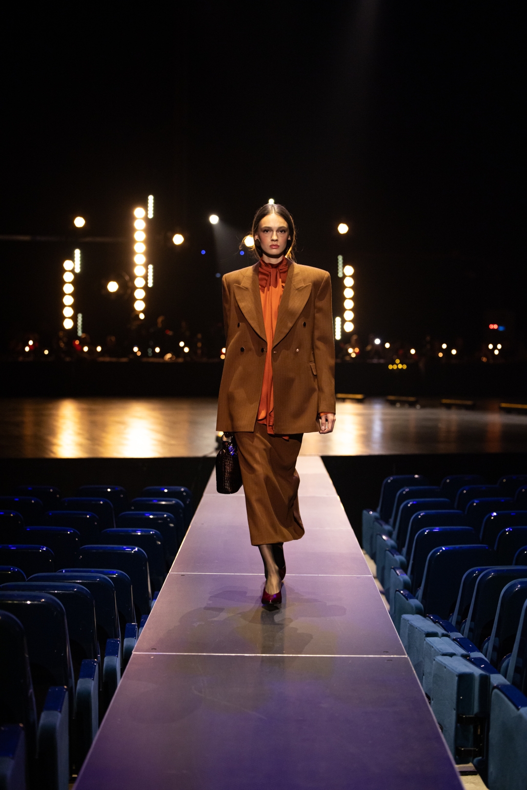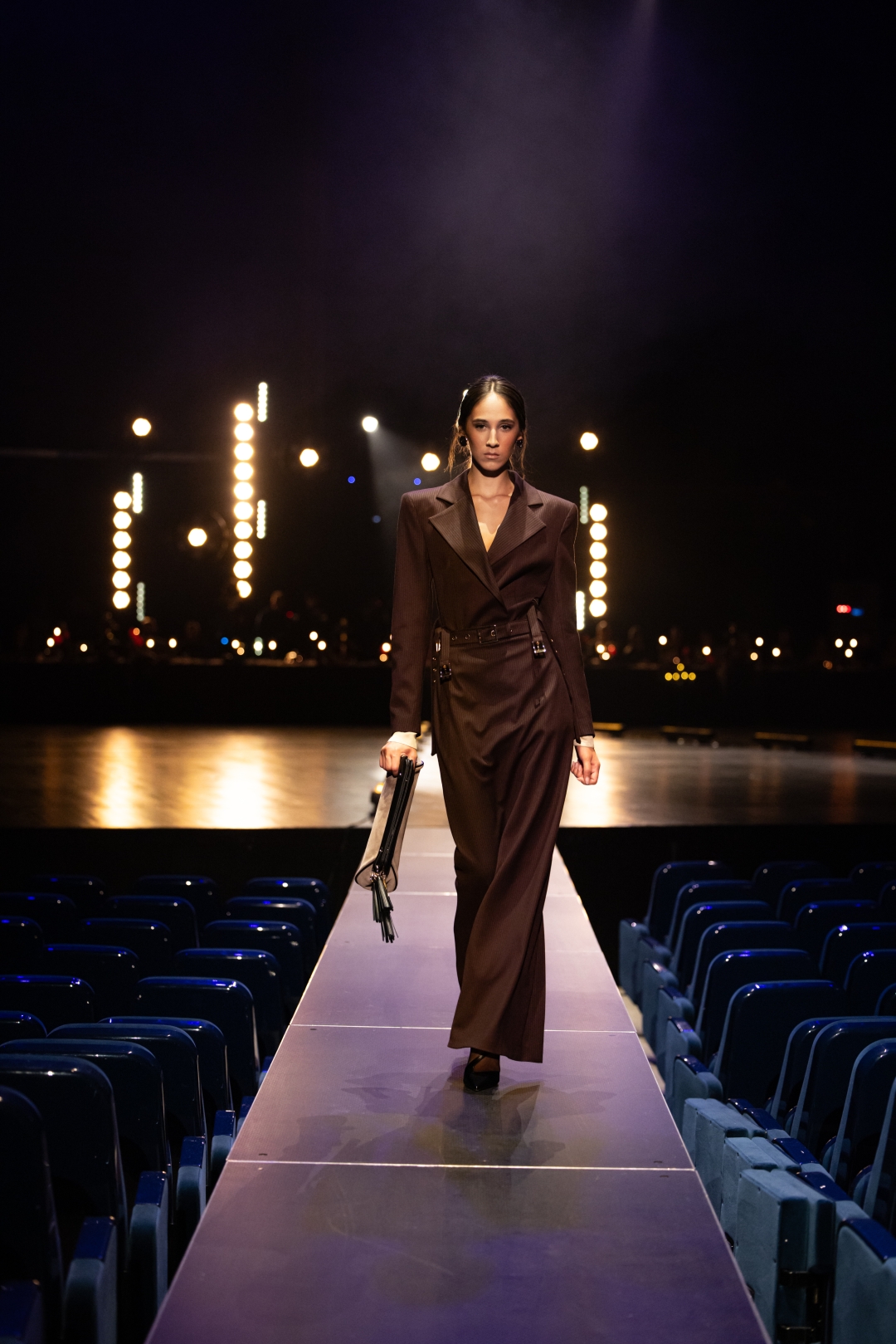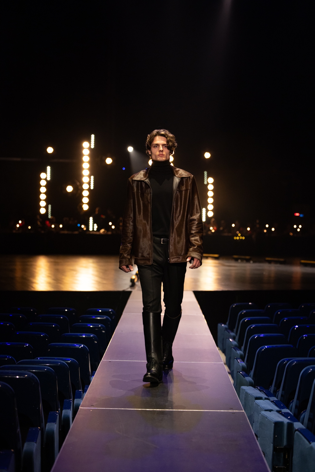 Na pisti dominiraju dugi kaputi koji prate liniju tela, naglašeni struk i oštri reveri, stvarajući utisak samouverenosti i luksuza. Paleta boja je sofisticirana: Karamela, konjak, maslinasto zelena, tamna čokolada i klasična crna. Ženski komadi balansiraju između strogoće i senzualnosti – oversized kaputi se kombinuju s visokim čizmama, kožom i providnim topovima. Muška kolekcija donosi klasične kapute, puffer jakne i shearling modele, sve stilizovano s dolčevitama, elegantnim pantalonama i torbama koje daju poslovni, ali izrazito moderan izgled.