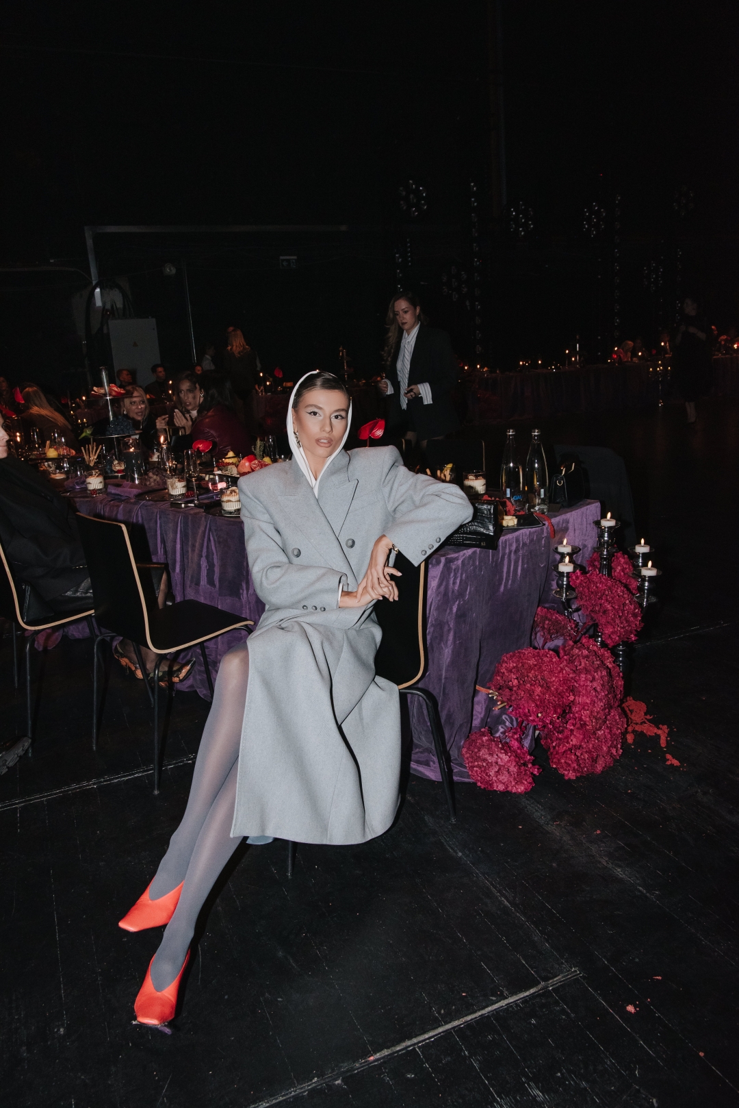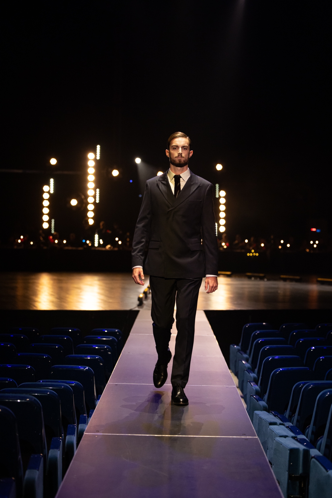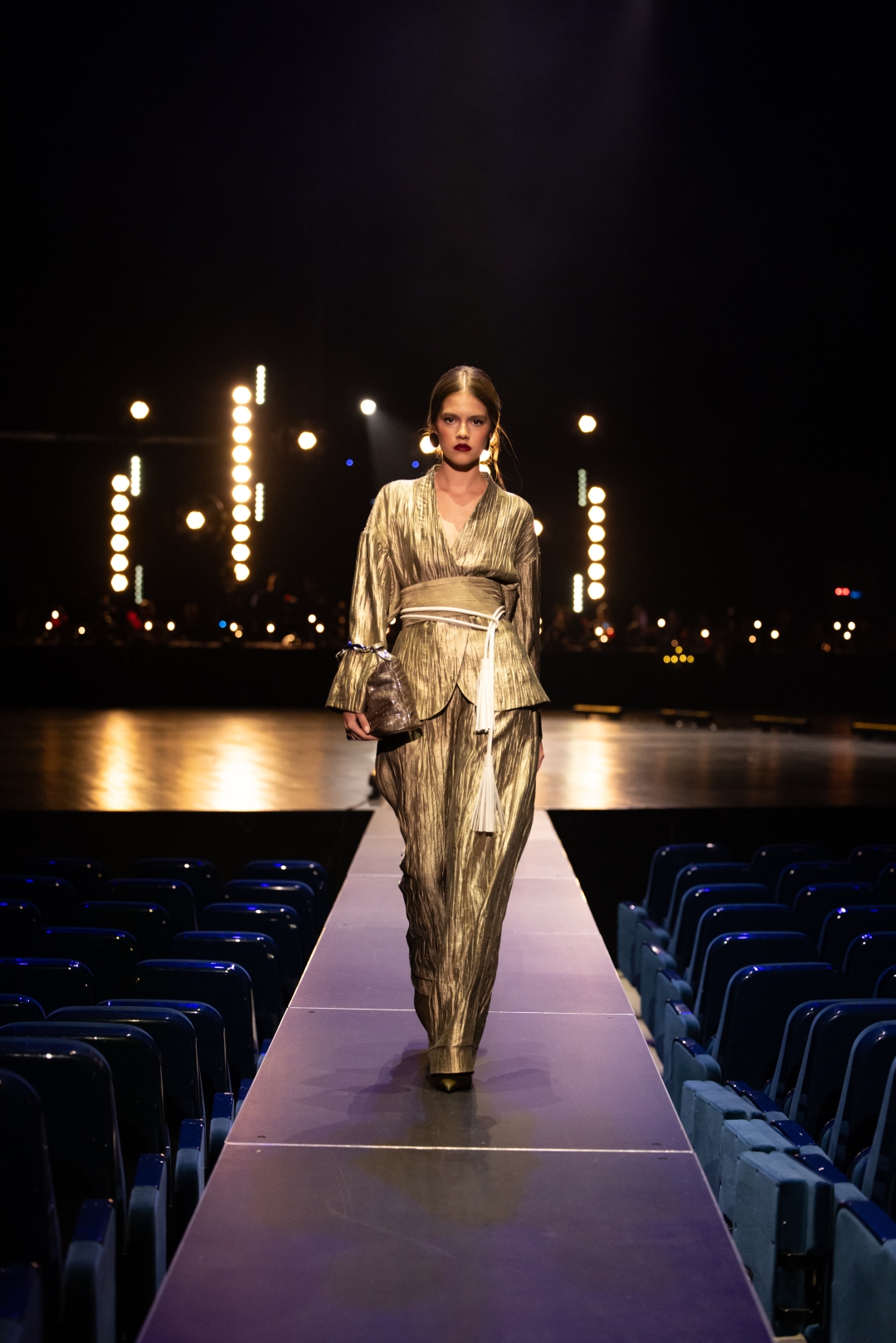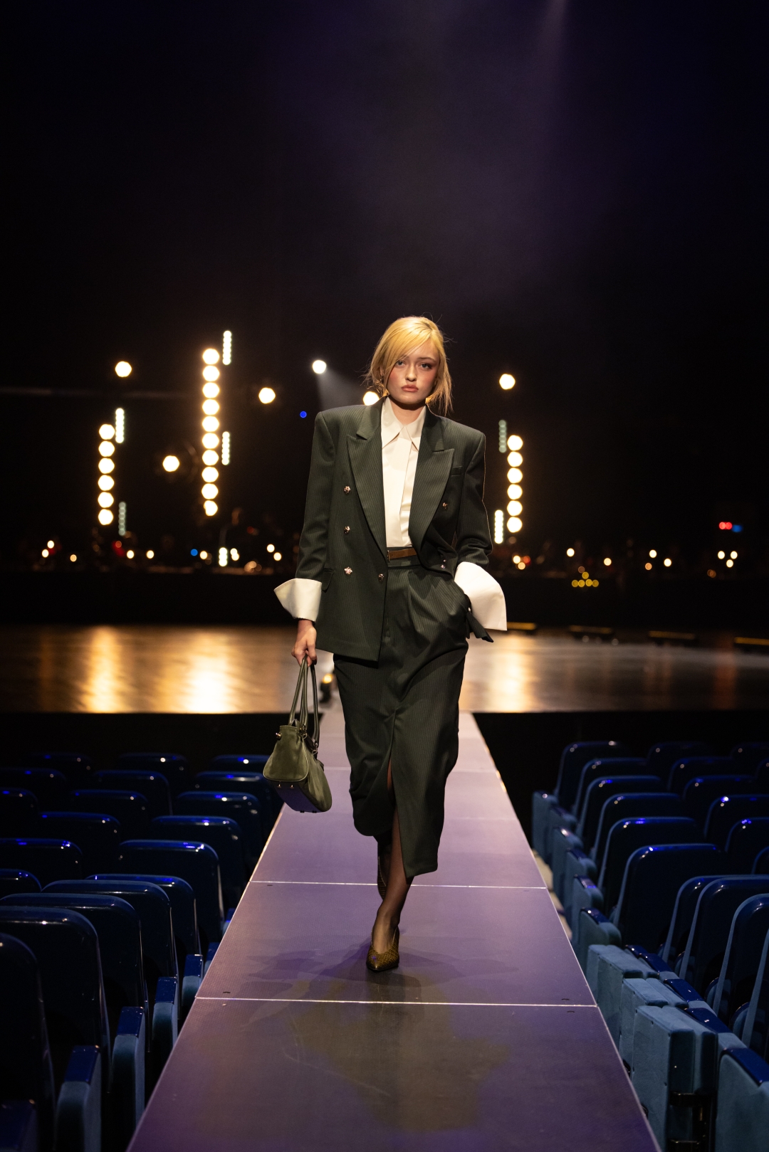 Na pisti dominiraju dugi kaputi koji prate liniju tela, naglašeni struk i oštri reveri, stvarajući utisak samouverenosti i luksuza. Paleta boja je sofisticirana: Karamela, konjak, maslinasto zelena, tamna čokolada i klasična crna. Ženski komadi balansiraju između strogoće i senzualnosti – oversized kaputi se kombinuju s visokim čizmama, kožom i providnim topovima. Muška kolekcija donosi klasične kapute, puffer jakne i shearling modele, sve stilizovano s dolčevitama, elegantnim pantalonama i torbama koje daju poslovni, ali izrazito moderan izgled.