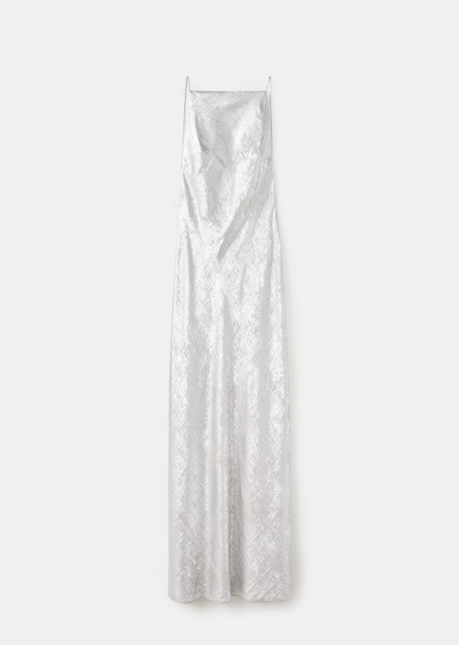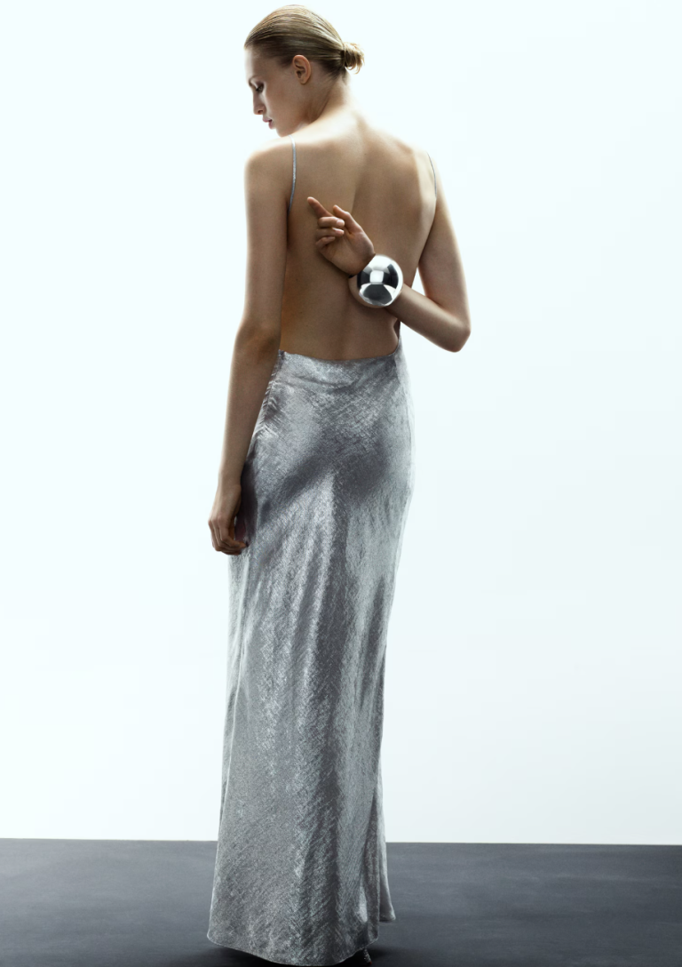 Na prvi pogled je jasno zašto je srebrna Mango haljina postala predmet (naše) požude. Njen srebrni, gotovo tečni sjaj odmah privlači pažnju i daje onaj dizajnerski look koji retko viđamo u pristupačnim kolekcijama. Haljina je maxi dužine, s američkim izrezom, tankim bretelama i otvorenim leđima – kroj koji naglašava jednostavnost, ali ostavlja utisak luksuza. Nije reč o klasičnoj slip haljini kakve već imamo u ormaru, već o pomno dizajniranom komadu koji odiše modernom elegancijom. Dovoljno upečatljiva da bude statement, ali i dovoljno minimalistička da zadrži dozu sofisticiranosti.