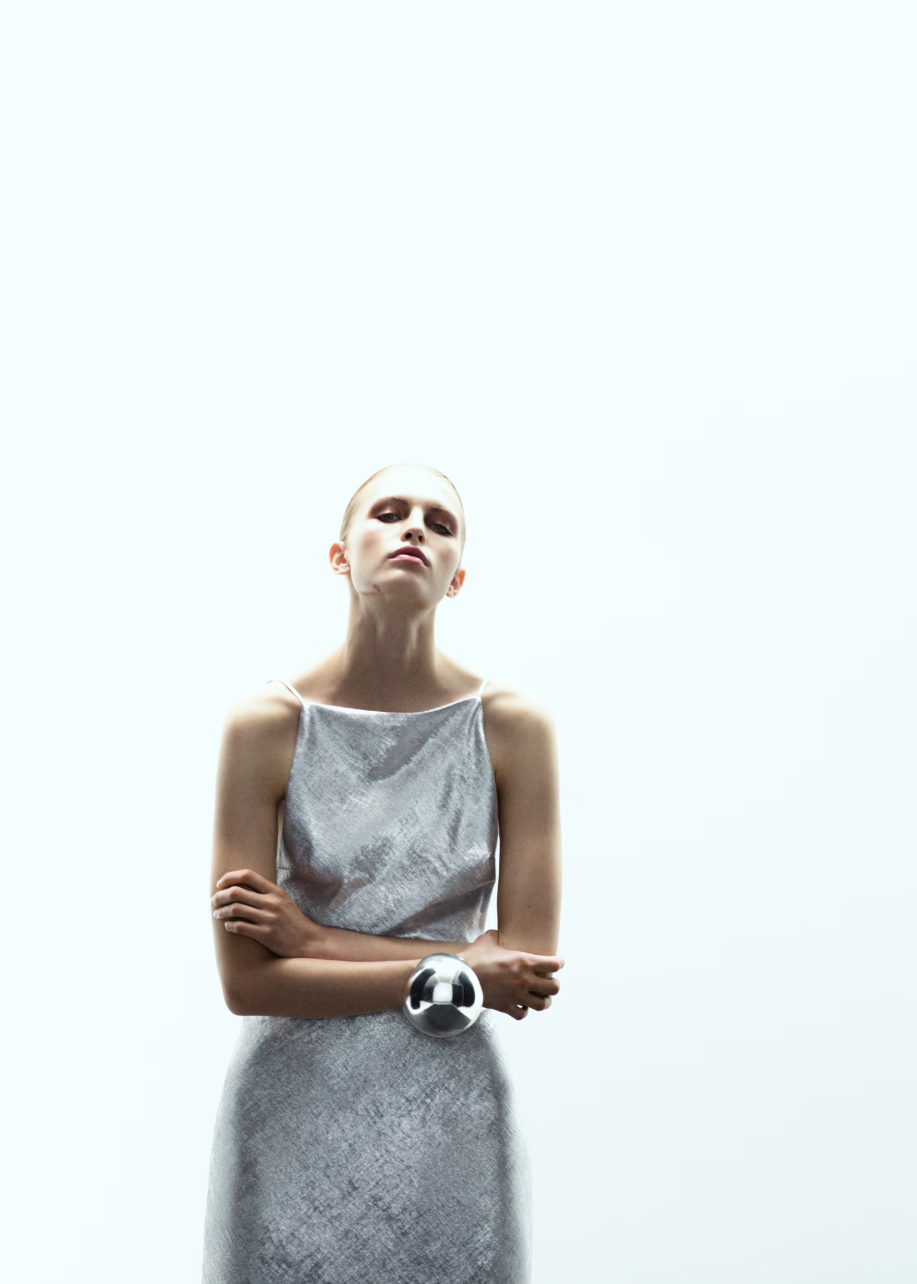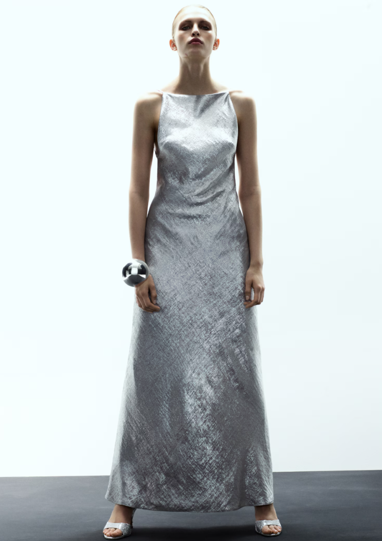 Svi već znamo koji materijali i teksture obeležavaju zimske žurke – svetlucave šljokice, metalik tkanina, pliš i veštačko krzno su večni sinonimi za prazničnu sezonu. A ove godine su se popisu pridružile i rese. No, styling savet koji imamo za vas je da ne mešate više od dva navedena elemenata u kombinaciji. Metalik sjaj definitivno je jako jednostavan za stilizovanje, a uvek izgleda moderno i šik. Upravo zato ga najčešće biramo za naše praznične autfite. Kada je pravilno izveden, može izgledati šik, elegantno i skupo. Baš poput modela iz najnovije Mango kolekcije. Mango srebrna haljina izgleda kao da ju je potpisala Balenciaga ili Acne Studios, a ne high street brend.
