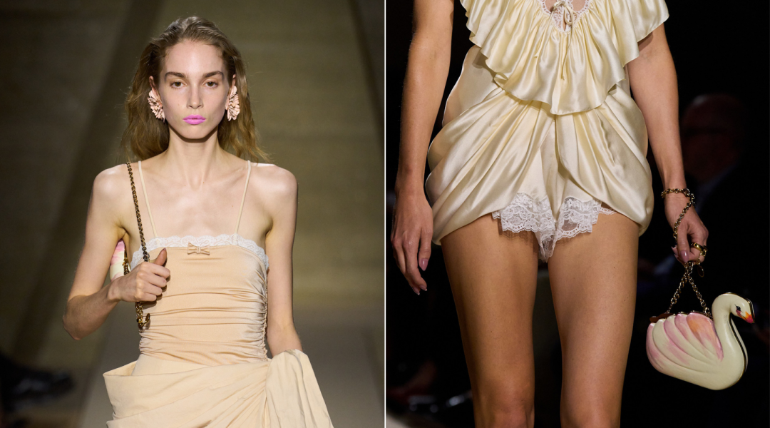 Kada smo na Chloé reviji ugledali torbu u obliku labuda, bili smo prijatno iznenađeni. Iako Moschino neretko potpisuje interesantne odevne komade koji se ubrzo nađu na našoj listi želja, ovoga puta je to Chloé Chemena Kamali. Beli labud koji poseduje roze detalj na krilu, čini Swan torbu. Ovaj model možete nositi kao clutch ili oko ramena, s obzirom na to da poseduje zlatni lanac. Ova torba, koliko god delovala nepraktično, zaista može upotpuniti vašu odevnu kombinaciju. Definitivno nije jedna od onih za svaki dan, već kolekcionarski komad koji pleni svojom autentičnošću. Na reviji, torba je bila prezentovana sa romantičnim kombinezonom sačinjenim od satena i čipke, ali i uz senzualan spoj krem topa i suknje.
