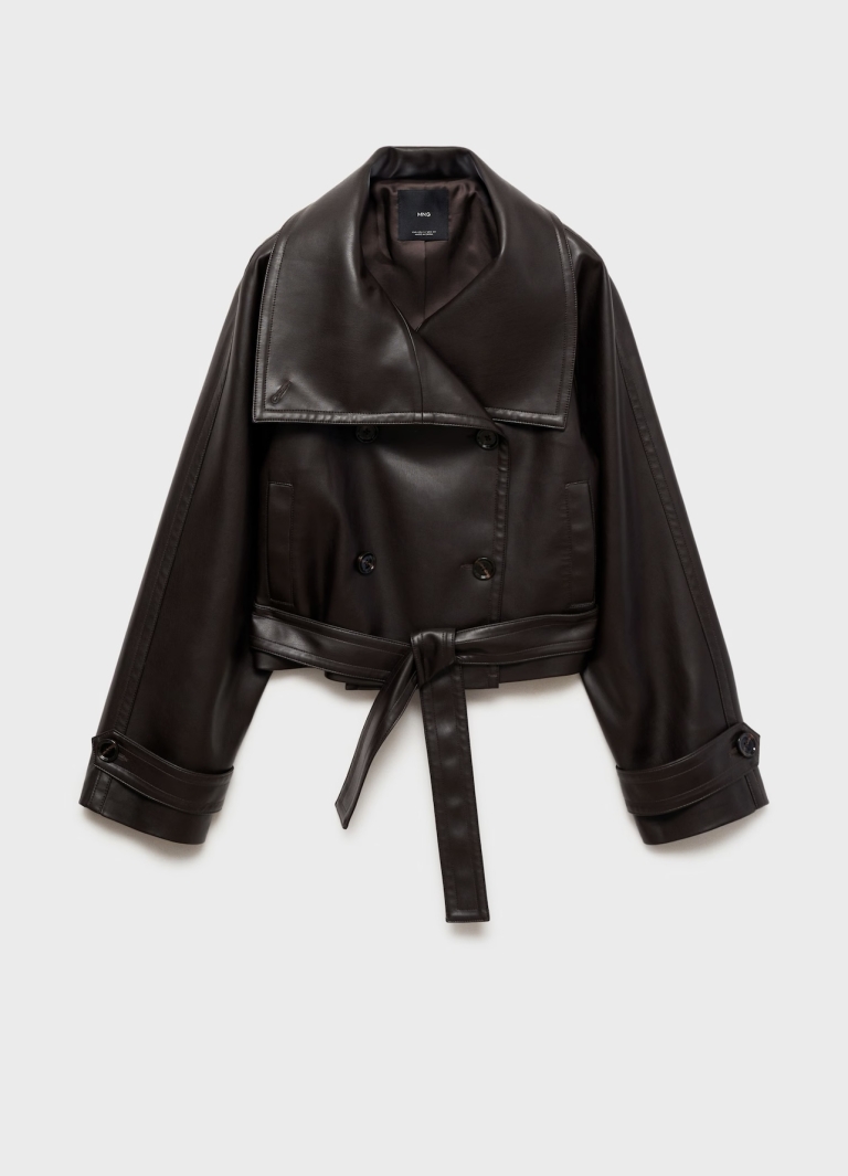 Mango verzija viralne sezonske jakne više igra na kartu quiet luxury momenta, kako ima kroj cropped trenča uz mogućnost podešavanja kragne po želji. Više je nosiva od Zarine, ali ako je ne stilizujete dobro može da izgleda poprilično basic.