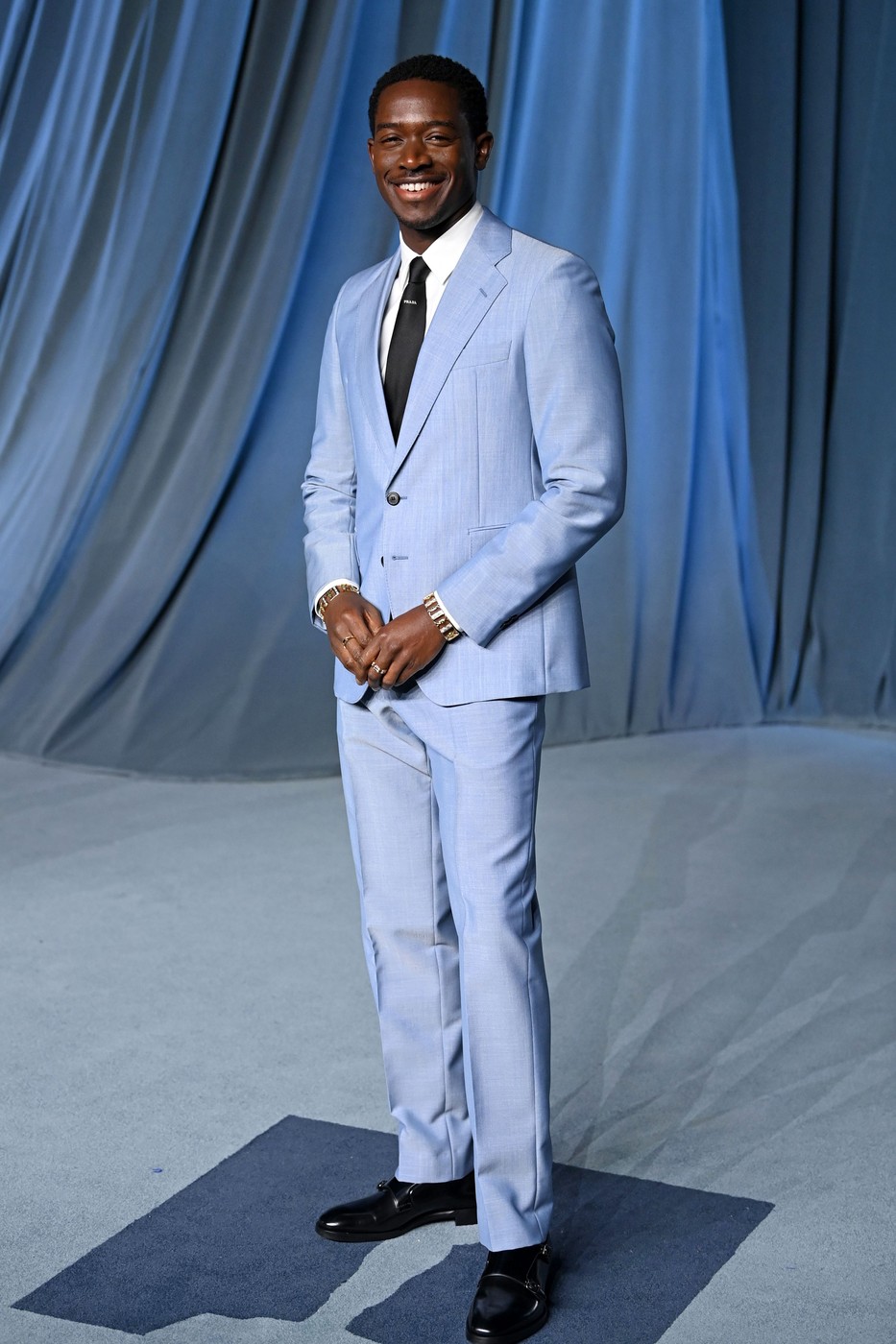 Nakon uloge u filmu F1 i pojavljivanja na Met Gali, glumac Damson Idris nalazi se na našem modnom radaru. Ovoga puta Idris je odlučio da ostane u plavom tonu manifestacije, pojavivši se u bebi plavom odelu i beloj košulji sa crnom kravatom. Crne elegantne cipele i interesantan odabir aksesoara upotpunili su ovu odevnu kombinaciju.