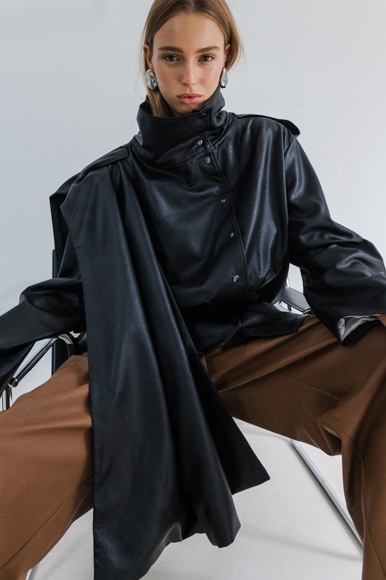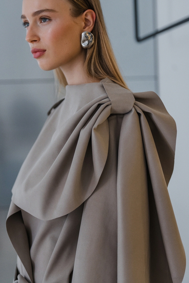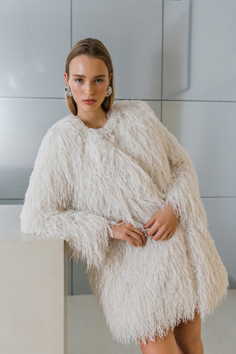 Miyo baloner u čokoladnoj nijansi spaja funkcionalnost i luksuz kroz tehničku tkaninu otpornu na vetar, UV zrake i vlagu. Rite baloner od japanskog organskog pamuka, te Sari eco leather jakna s odvojivim šalom, reinterpretiraju klasiku kroz pokret i volumen. Marita jakna od eko perja utelovljuje lakoću i dramatičnost, dok Syra korset haljina u skulpturalnom volumenu redefiniše savremenu ženstvenost.